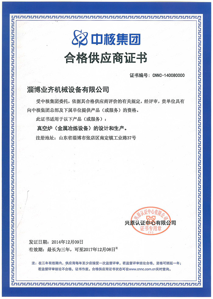 歲(suì)末年初,宿迁金庆化工制造集团(5G网站)全體員工(gong)迎來喜訊,經過四(si)年多愉快而成功(gong)的合作之旅,以及(ji)近半年的嚴格評(píng)價、審核、認證,業齊(qí)機械順利取得中(zhōng)國核工業集團的(de)合格供應商證書(shū)。這标志着以2015新的(de)一年爲起點,淄博(bo)業齊機械與中國(guo)核工業集團在真(zhēn)空爐非标設計、研(yan)發、生産領域将邁(mài)入更深入、更緊密(mì)的合作!